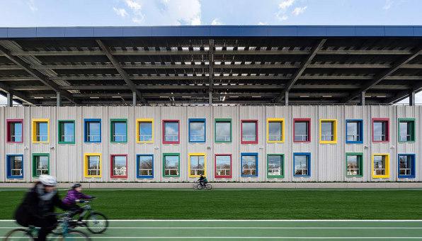 Nowoczesny żłobek, znajdujący się w niemieckim mieście Darmstadt, przechwytuje i przekształca promienie słońca w energię elektryczną dzięki panelom słonecznym zainstalowanym bezpośrednio na fasadzie budynku. W maksymalnym wykorzystaniu nasłonecznienia pomaga również nietypowy, kanciasty kształt budynku. Za jego projekt odpowiada firma Opus Architekten.