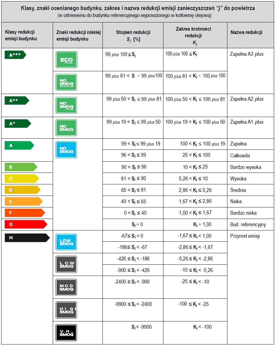 Poniższa tabela prezentuje wyszczególnienie krotności i stopni redukcji, klas znaków niskiej emisji ocenianego budynku oraz nazewnictwa, w porównaniu z budynkiem referencyjnym wyposażonym w kotłownię węglową.