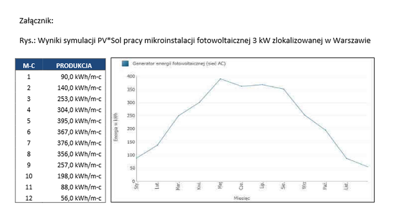 służy potrzebom budynku i sprzedaży nadwyżek), kosztów eksploatacyjnych w wysokości 70 zł/kW netto, spadek wydajności 1,5% rocznie w założonym